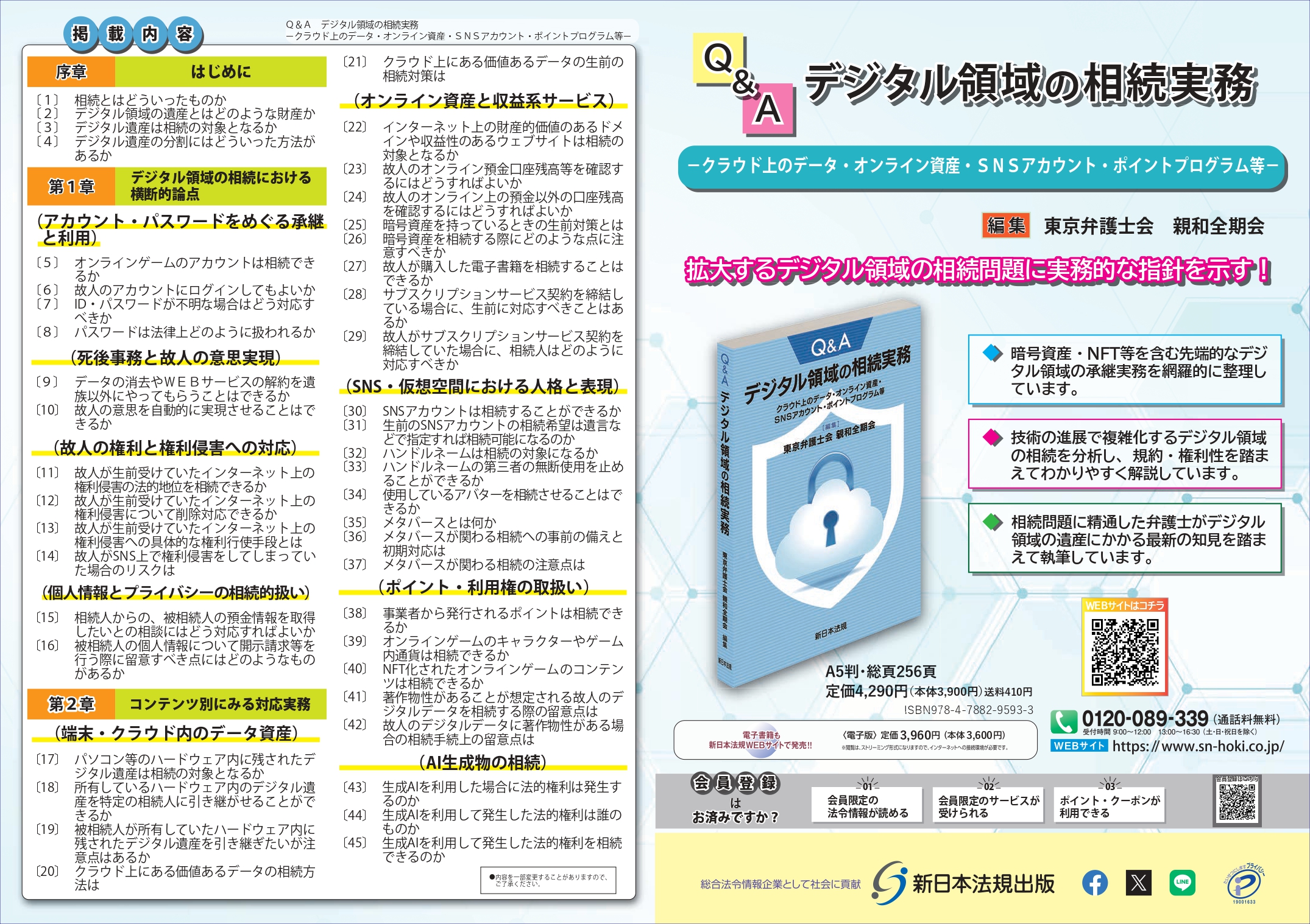 Q&A デジタル領域の相続実務−クラウド上のデータ・オンライン資産・SNSアカウント・ポイントプログラム等− お勧め商品 相続税 資産税 出版社 新日本法規出版 ■著者:編集/東京弁護士会親和全期会 ■発刊日:2026年1月15日 ■ISBN:978-4-7882-9593-3 ■書籍紹介 拡大するデジタル領域の相続問題に実務的な指針を示す! ◆暗号資産・NFT等を含む先端的なデジタル領域の承継実務を網羅的に整理しています。 ◆技術の進展で複雑化するデジタル領域の相続を分析し、規約・権利性を踏まえてわかりやすく解説しています。 ◆相続問題に精通した弁護士がデジタル領域の遺産にかかる最新の知見を踏まえて執筆しています。 在庫状態 : 注文可能 ¥4,290(税込) 数量