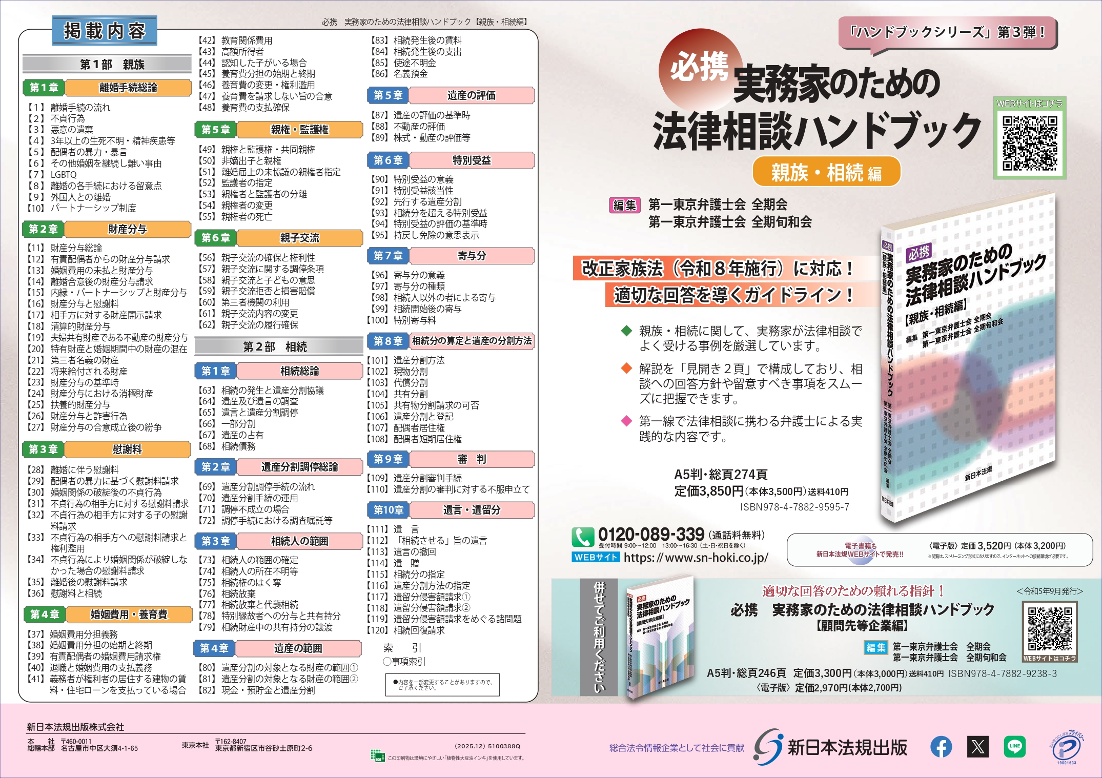必携 実務家のための法律相談ハンドブック【親族・相続編】 相続税 その他 出版社 新日本法規出版 ■著者:編集/第一東京弁護士会 全期会、第一東京弁護士会 全期旬和会 ■発刊日:2026年1月21日 ■ISBN:978-4-7882-9595-7 ■書籍紹介 改正家族法(令和8年施行)に対応! 適切な回答を導くガイドライン! ◆親族・相続に関して、実務家が法律相談でよく受ける事例を厳選しています。 ◆解説を「見開き2頁」で構成しており、相談への回答方針や留意すべき事項をスムーズに把握できます。 ◆第一線で法律相談に携わる弁護士による実践的な内容です。 在庫状態 : 注文可能 ¥3,850(税込) 数量