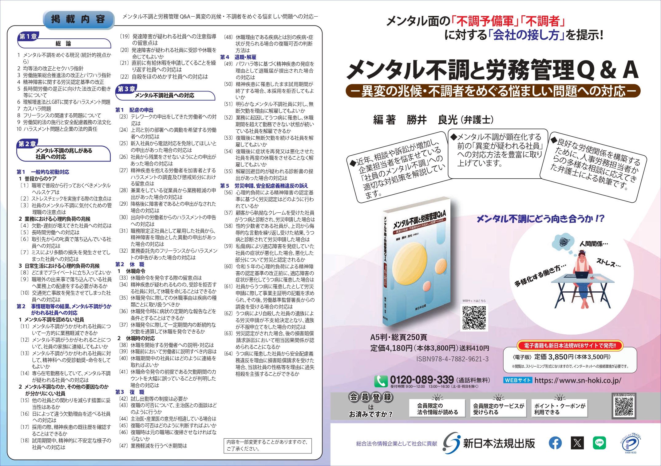 メンタル不調と労務管理Q&A−異変の兆候・不調者をめぐる悩ましい問題への対応− お勧め商品 その他 出版社 新日本法規出版 ■著者:編著/勝井良光(弁護士) ■発刊日:2026年3月2日 ■ISBN:978-4-7882-9621-3 ■書籍紹介 メンタル面の「不調予備軍」「不調者」に対する「会社の接し方」を提示! ◆近年、相談や訴訟が増加し、企業担当者を悩ませている「社員のメンタル不調」への適切な対処策を解説しています。 ◆メンタル不調が顕在化する前の「異変が疑われる社員」への対応方法を豊富に取り上げています。 ◆良好な労使関係を構築するために、人事労務担当者からの多様な相談に応えてきた弁護士による執筆です。 在庫状態 : 注文可能 ¥4,180(税込) 数量